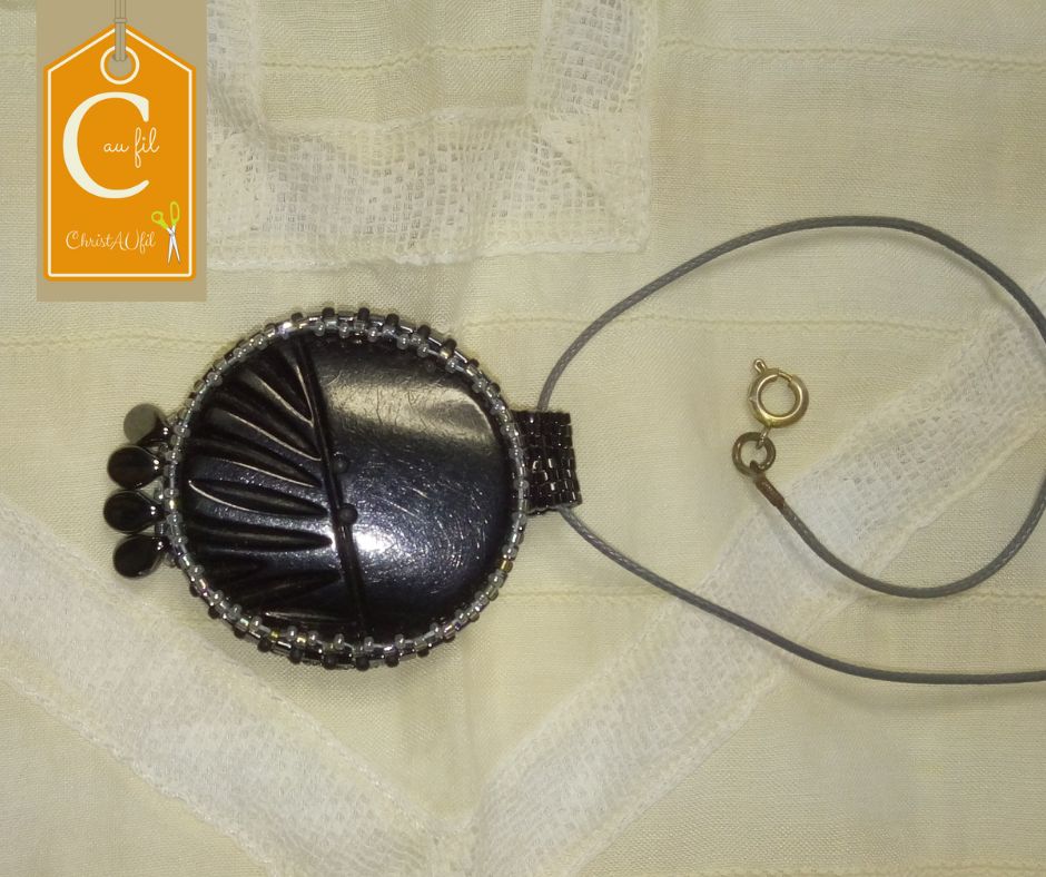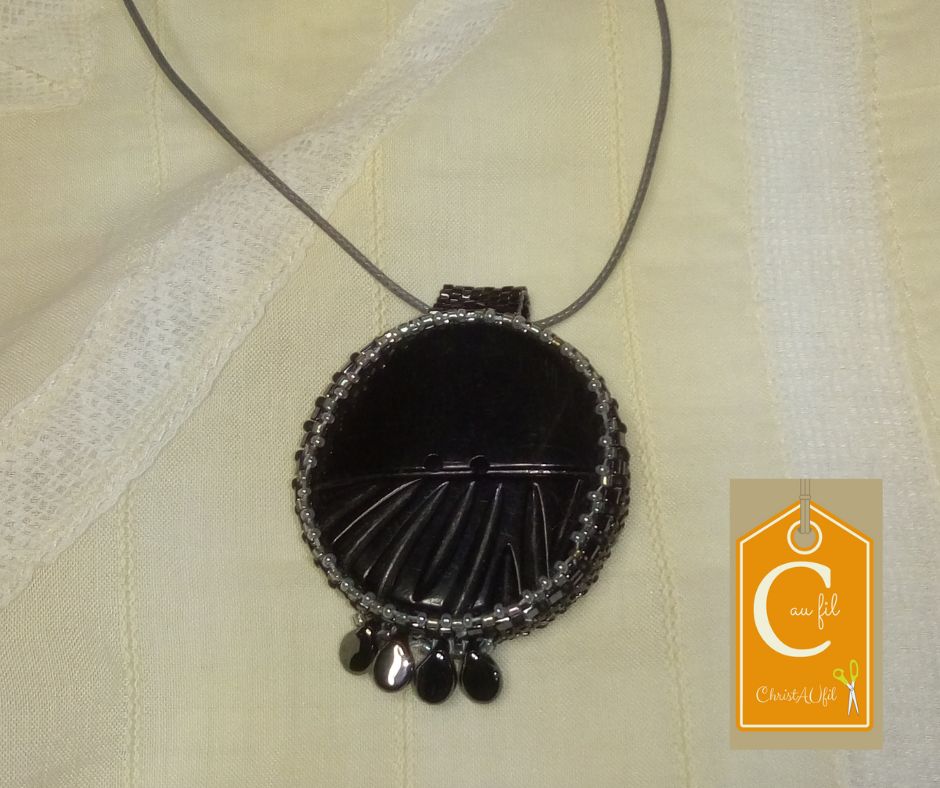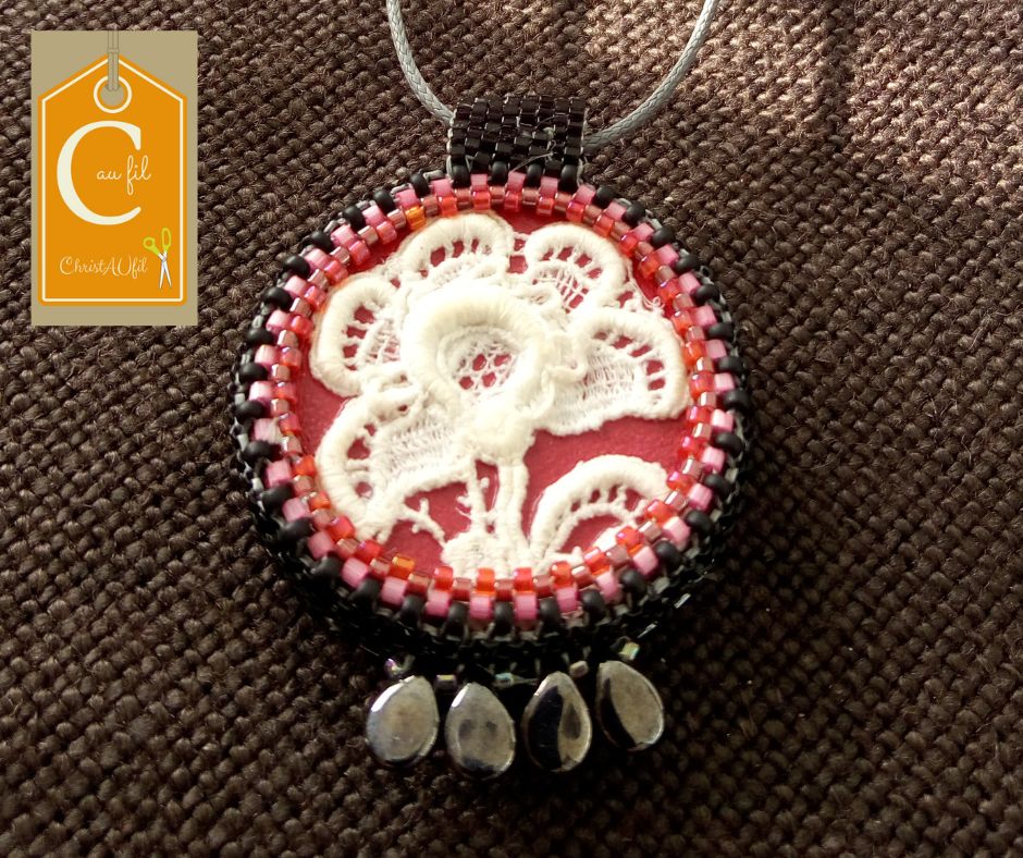Bouton noir ref 12037 Diamètre 3,8 cm serti de perles japonaises noires avec 4 gouttes noires en partie basse. Le verso est agrémenté d’une dentelle ancienne blanche sur fond rouge . Pendentif entièrement fait main fourni avec un lien de longueur totale 40 cm avec fermeture et chaînette lg 1 cm.
