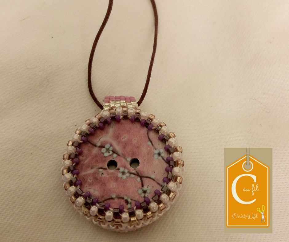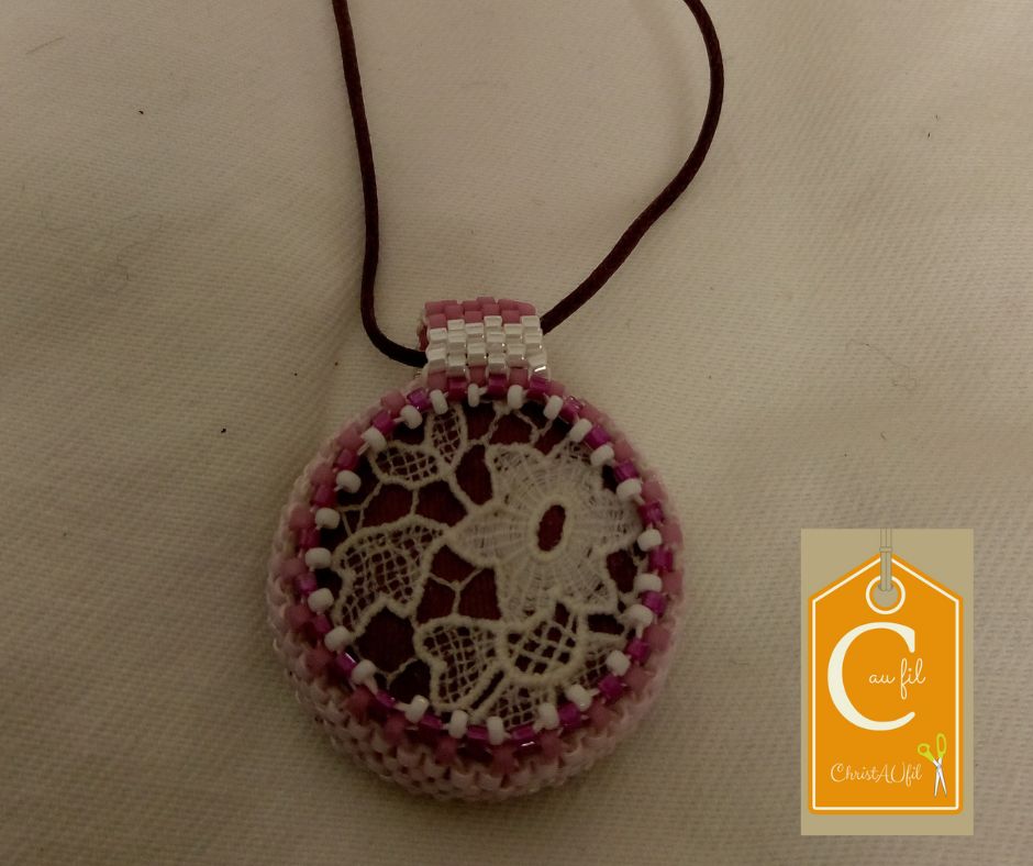 Bouton rose ref 14065 avec motif de fines blanches florales. Diamètre 3,8 cm serti de perles japonaises roses. Le verso est agrémenté d’une délicate dentelle blanche. Pendentif entièrement fait main fourni avec un lien marron foncé de longueur totale 40 cm avec fermeture et chaînette d’accrochage argentée lg 6 cm.