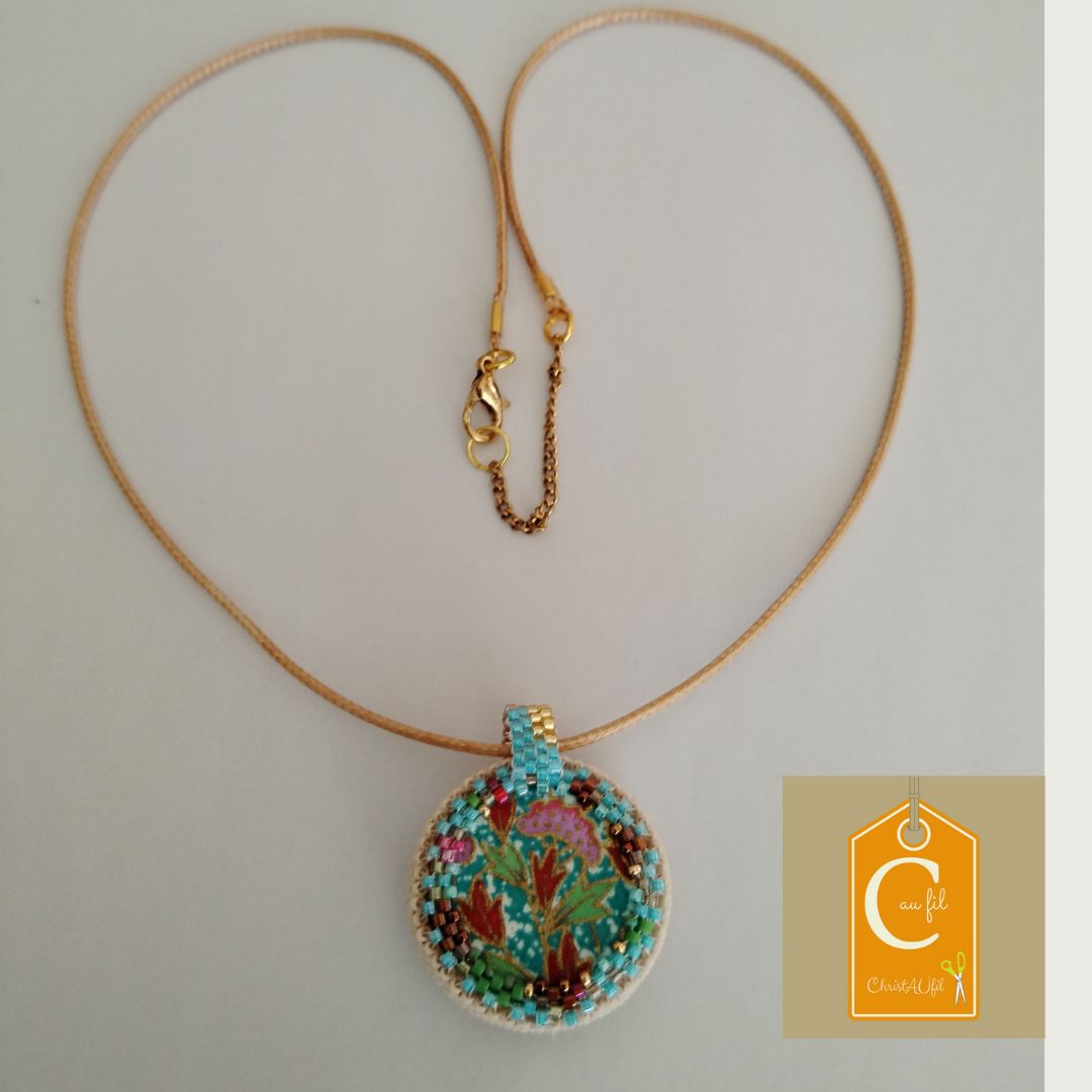 Bouton ref 14139 rosé avec des fleurs dorées légèrement en relief. Diamètre 3,2 cm serti de perles japonaises couleur crème et dorées. A l’arrière, les perles sont bleues ciel, vertes, dorées, avec quelques touches de brun. Le verso est agrémenté d’un joli papier japonais fleuri, avec vernis de protection. Pendentif entièrement fait main fourni avec un lien couleur crème-doré de longueur totale 43 cm avec fermeture et extension chainette lg 5 cm.