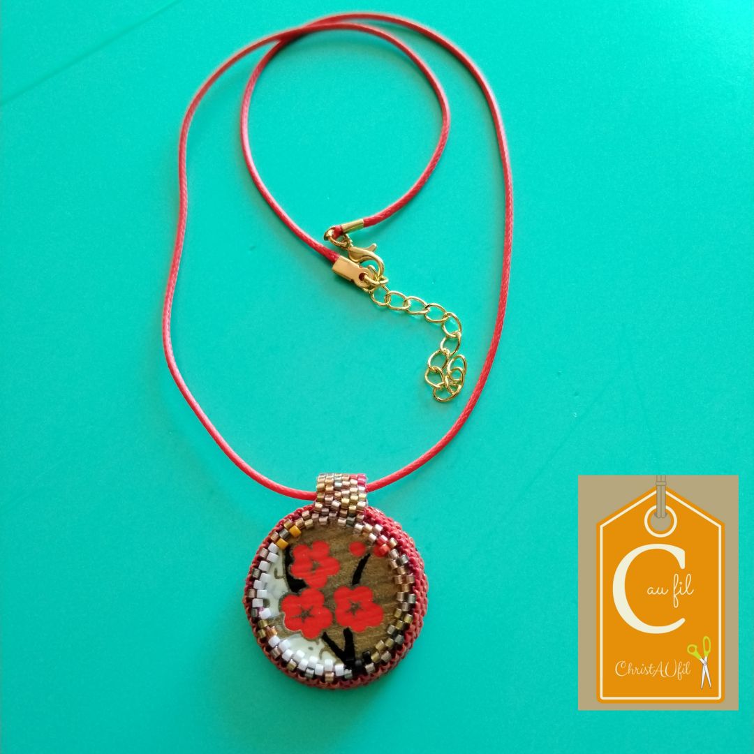 Bouton ref 14184 rouge avec au centre la double lettre C. Diamètre 3,5 cm serti de perles japonaises rouges. A l’arrière, les perles sont blanches, bronze et quelques touches de noir. Le verso est agrémenté d’un joli papier japonais avec vernis de protection. Pendentif entièrement fait main fourni avec un lien rouge de longueur totale 44 cm + fermeture et extension chainette dorée lg 5 cm.