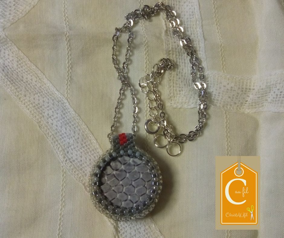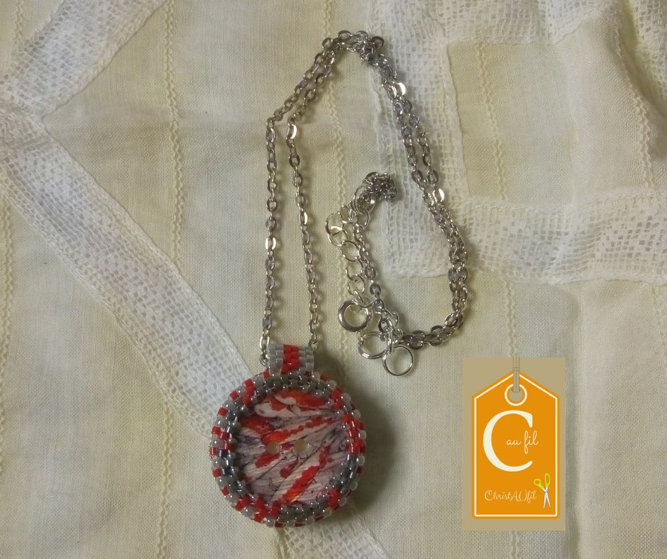 Bouton ref 14087 rouge et gris à 2 trous. Diamètre 2,8 cm serti de perles japonaises irisées grises. Le verso est agrémenté d’un simili cuir couleur grise. Pendentif entièrement fait main fourni avec une chainette métallique de longueur totale 40 cm avec fermeture et chaînette métallique lg 5 cm.