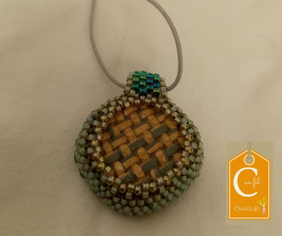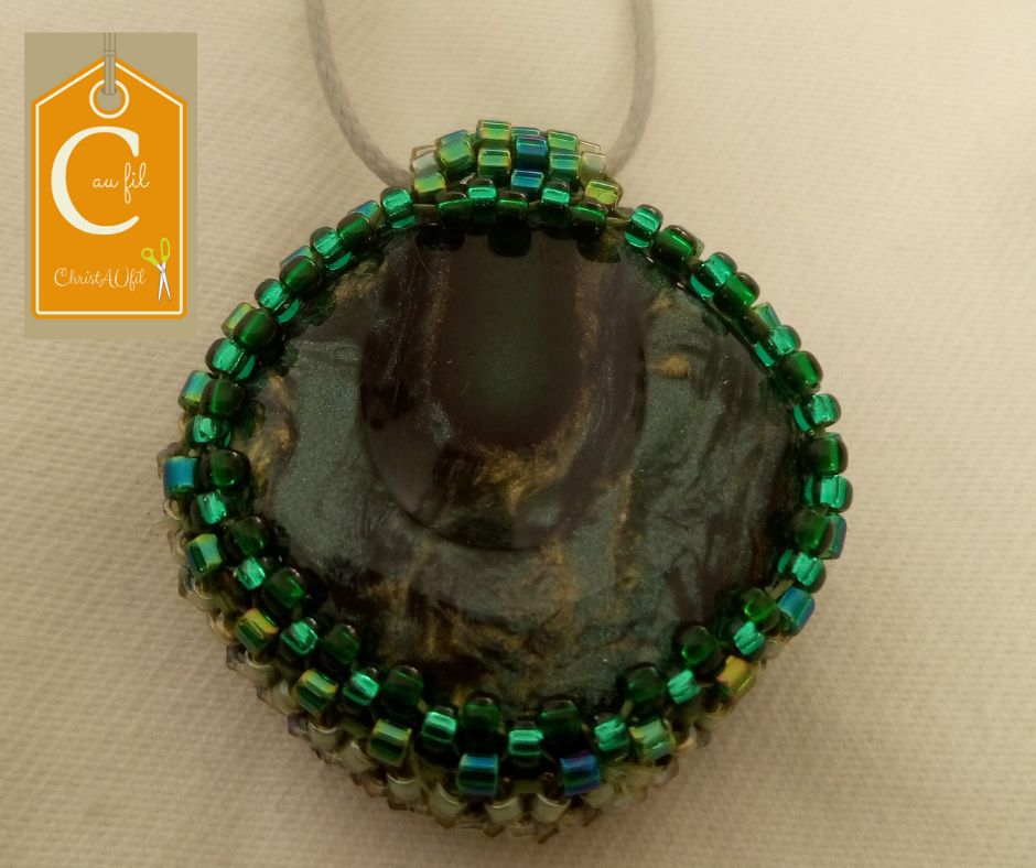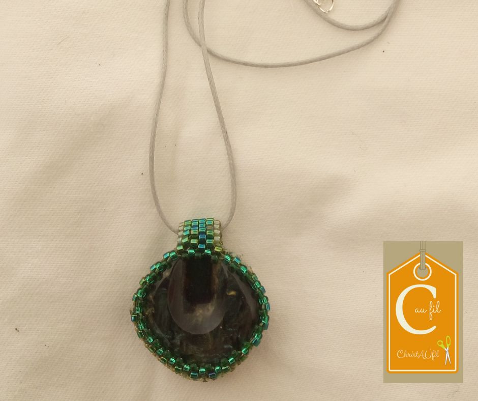 Bouton vert ref 17066. Diamètre 2,5 cm serti de perles japonaises irisées vert pâle. Le verso est agrémenté d’un textile vert et jaune. Pendentif entièrement fait main fourni avec un lien gris de longueur totale 40 cm avec fermeture et chaînette d’accrochage argentée lg5 cm.