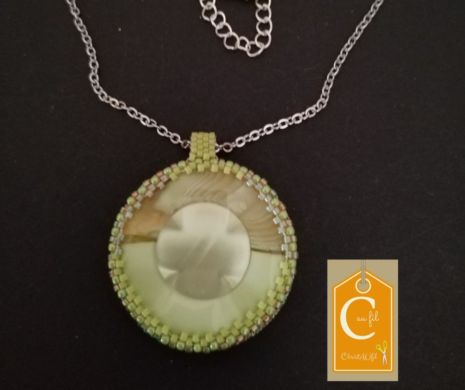 Bouton ref 15208 vert anis. Diamètre 4,2 cm serti de perles japonaises irisées vertes. A l’arrière, les perles sont vertes avec quelques touches de blanc. Le verso est agrémenté d’un joli papier japonais fleuri, avec vernis de protection. Pendentif entièrement fait main fourni avec un chainette métallique de longueur totale 42 cm + fermeture et extension chainette métal lg 5 cm.
