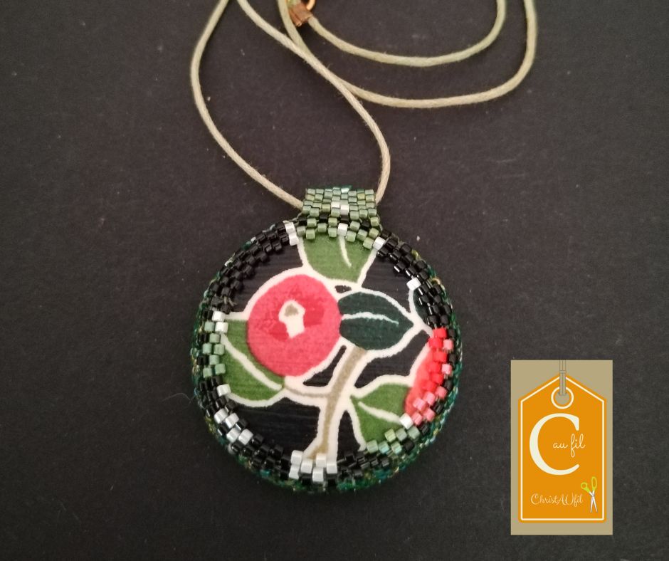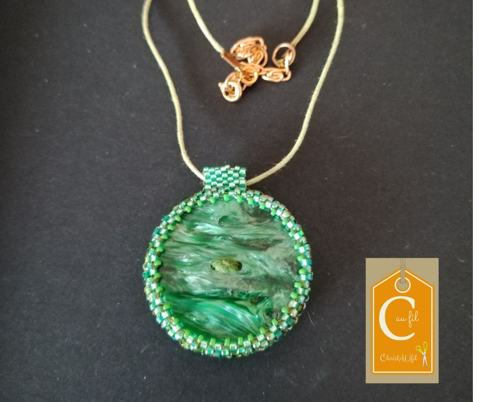Bouton ref 15212 irisé vert avec 2 trous au centre reliés. Diamètre 4 cm serti de perles japonaises irisées vertes. A l’arrière, les perles sont vertes, rouges, noires avec quelques touches de blanc. Le verso est agrémenté d’un joli papier japonais fleuri, avec vernis de protection. Pendentif entièrement fait main fourni avec un lien vert de longueur totale 44 cm + fermeture et extension chainette dorée lg 5 cm.