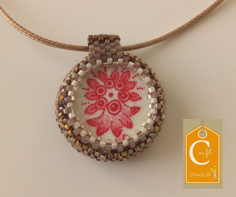 Bouton brun ref 16011. Diamètre 2,8 cm serti de perles japonaises irisées bronze. Le verso représente un motif floral fuchsia sur fond blanc. Pendentif entièrement fait main fourni avec un lien de couleur marron foncé de longueur totale 42 cm avec fermeture et chaînette d’accrochage dorée lg 5 cm.