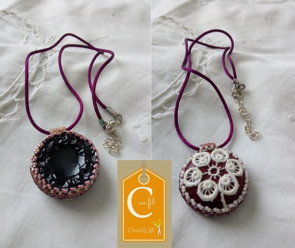 Bouton ref 12042 noir avec dessins en creux sur le pourtour. Diamètre 3 cm serti de perles japonaises de plusieurs nuances de rose. Le verso est agrémenté d’une dentelle blanche ancienne. Pendentif entièrement fait main fourni avec un lien de longueur totale 41 cm  avec fermeture et chaînette lg 5 cm.
