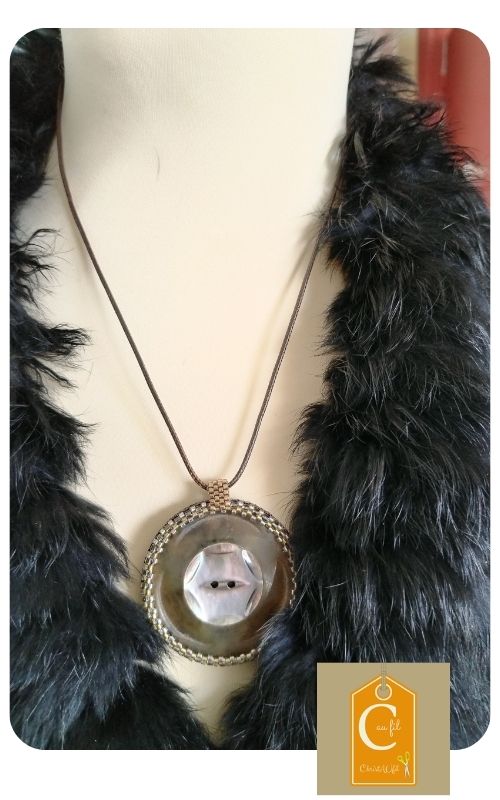 Pendentif entièrement fait main fourni avec un lien brun de longueur totale 42 cm + fermeture et extension chainette bronze de 5 cm.