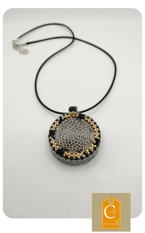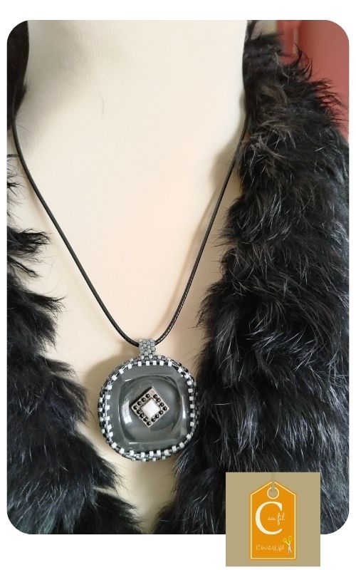 Bouton couleur anthracite avec au centre un petit bouton carré bordé de perles noir, serti de perles japonaises irisées bleu-gris. A l’arrière, les perles sont noires et dorées. Le dos du pendentif est agrémenté d’un joli papier japonais, avec vernis de protection.