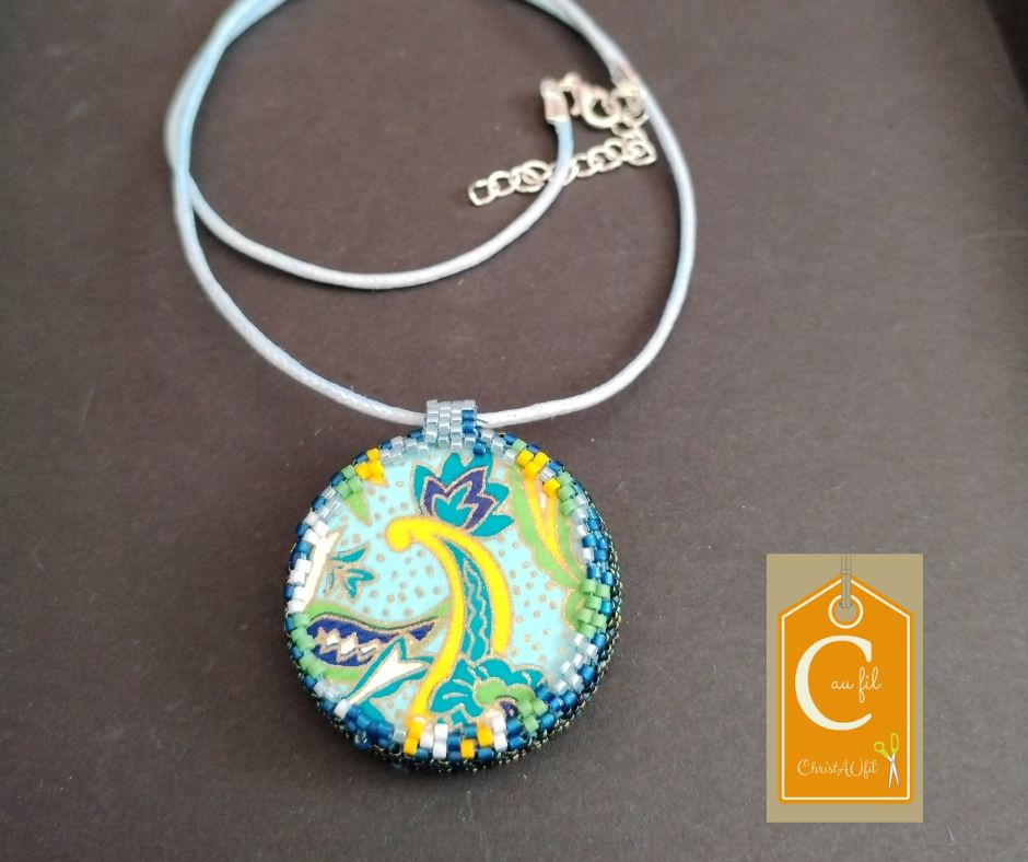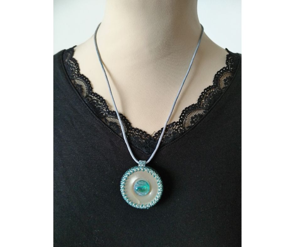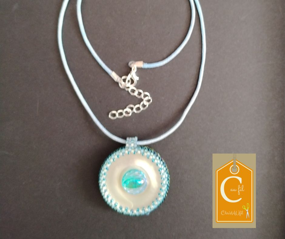 Pendentif entièrement fait main fourni avec un lien bleu ciel de longueur totale 50 cm + fermeture et extension chainette argentée longueur 5 cm.