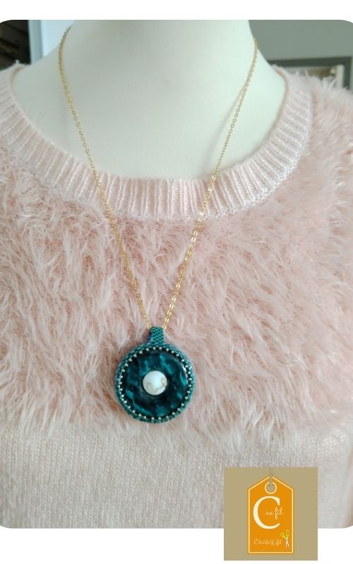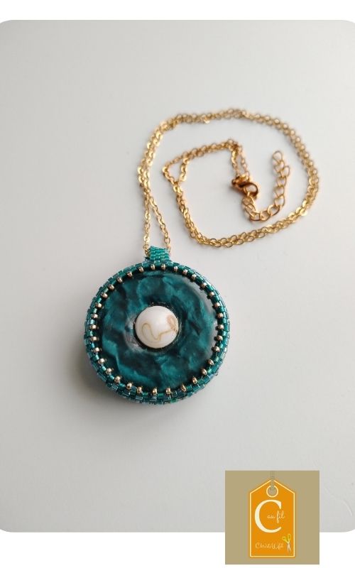 Pendentif entièrement fait main fourni avec une chainette de longueur totale 53cm + fermeture et extension chainette dorée de 5 cm.