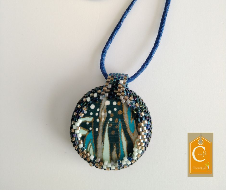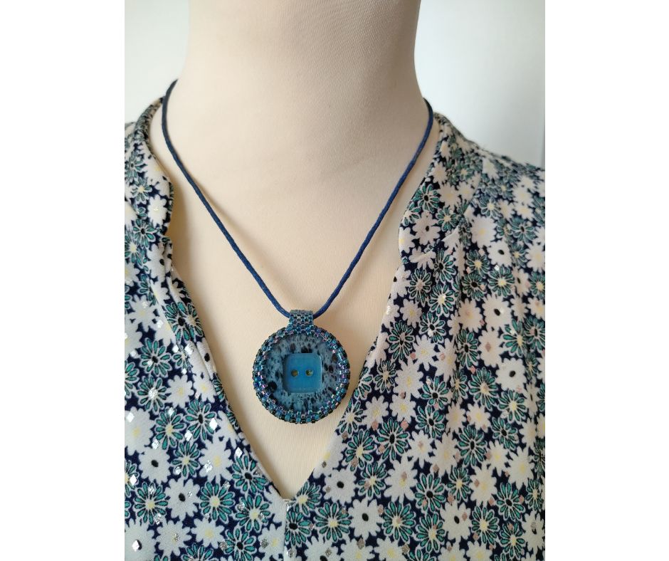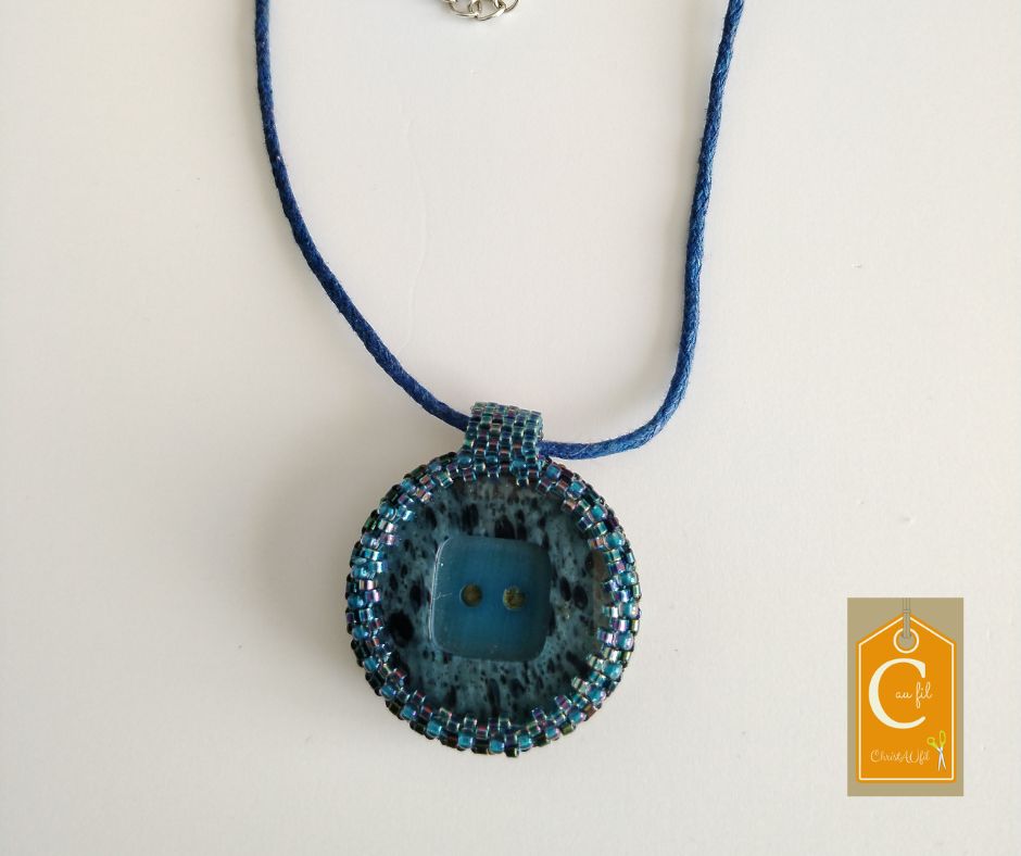 Bouton bleu moucheté avec 2 trous au milieu d’un carré, serti de perles japonaises irisées bleues. A l’arrière, les perles sont bleues, vertes, argentées. Le dos du pendentif est agrémenté d’un joli papier japonais, avec vernis de protection.