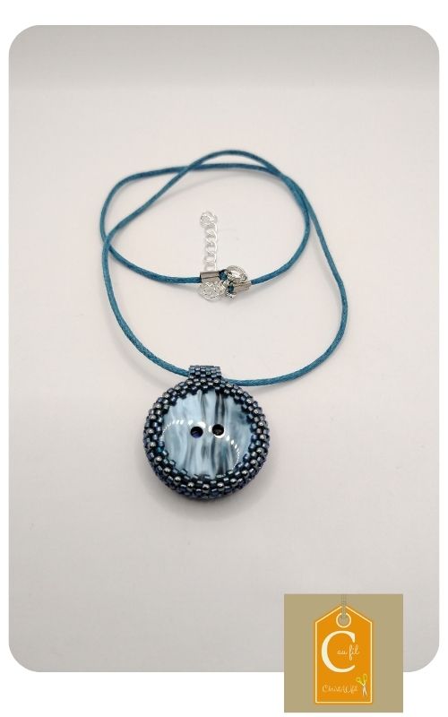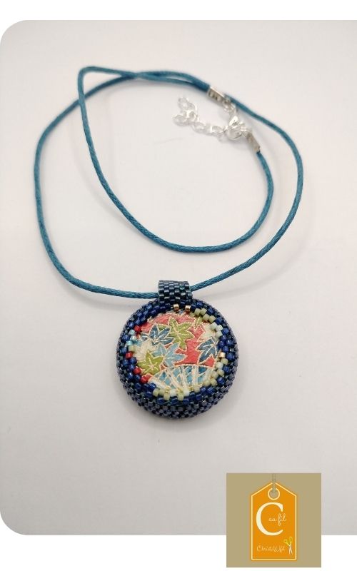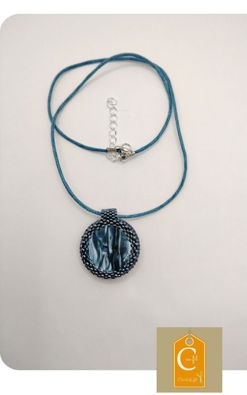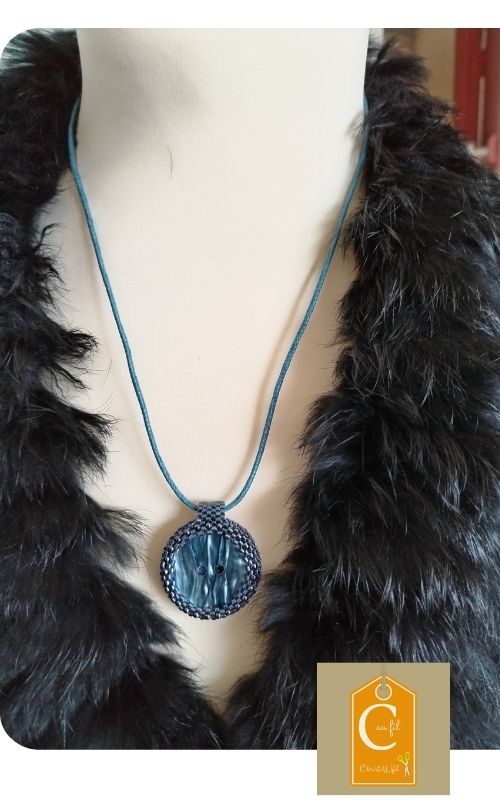 Bouton aux reflets bleu pétrole/ardoise, serti de perles japonaises bleu nuit irisées. A l’arrière, les perles sont bleues, vert pâle, rouges. Le dos du pendentif est agrémenté d’un joli papier japonais, avec vernis de protection.