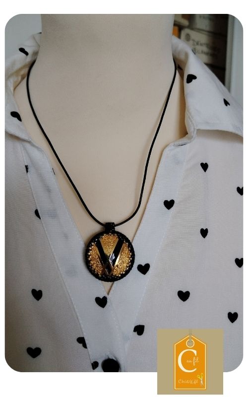 Pendentif entièrement fait main fourni avec un lien noir de longueur totale 43 cm + fermeture et extension chainette dorée de 5 cm.