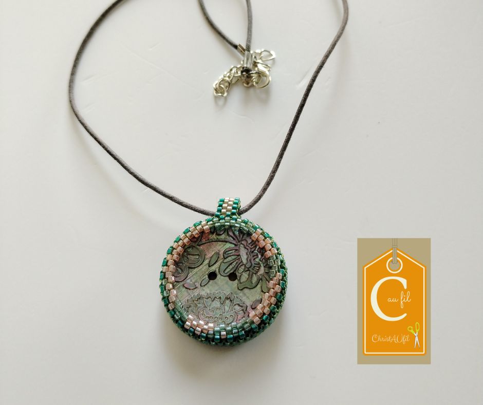 Bouton en nacre, de couleur verte avec des motifs floraux incrustés serti de perles japonaises irisées vertes, et beiges. A l’arrière, les perles sont bleues turquoise, dorées, jaunes avec quelques touches de blanc. Le verso est agrémenté d’un joli papier japonais fleuri, avec vernis de protection.