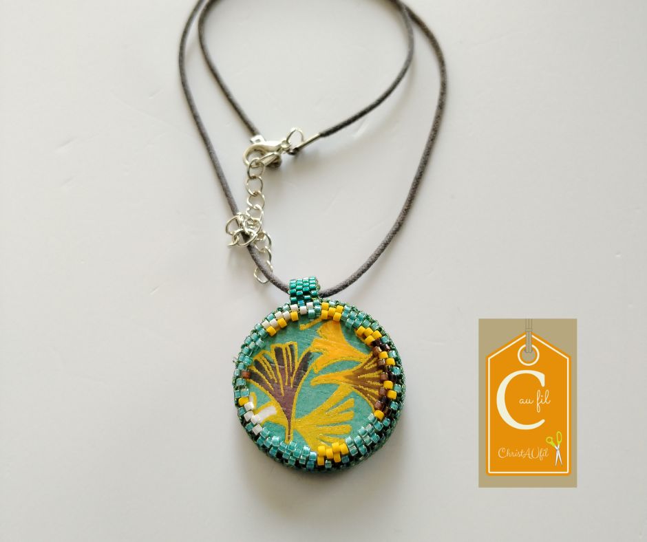 Pendentif entièrement fait main fourni avec un lien gris de longueur totale 40 cm + fermeture et extension chainette métallique de 5 cm.