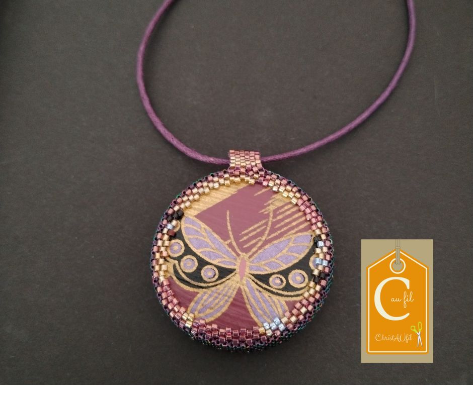 Bouton mauve avec un dessin géométrique pailleté serti de perles japonaises irisées mauves et prune. A l’arrière, les perles sont mauve, dorées, avec quelques touches de bleu. Le verso est agrémenté d’un joli papier japonais représentant un papillon, avec vernis de protection.
