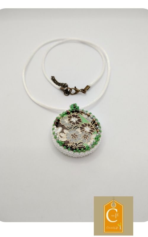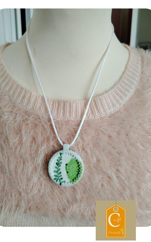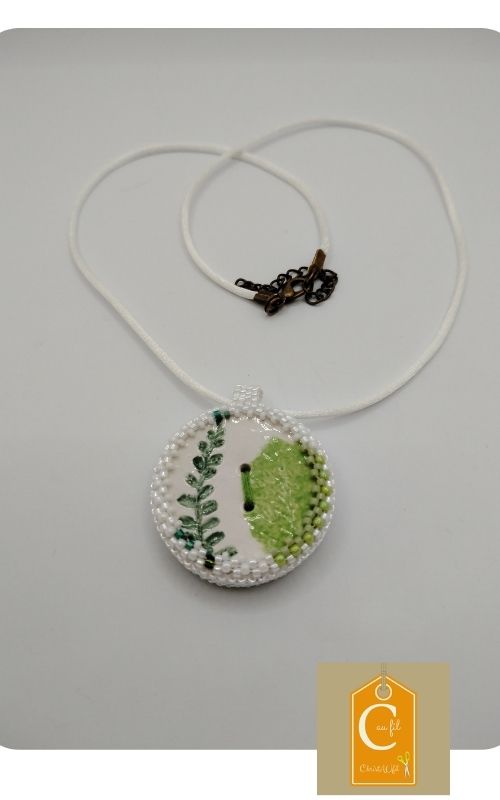 Bouton en porcelaine de la marque « Sibelle ma belle », fougère sur fond blanc serti de perles japonaises irisées blanches et vertes. A l’arrière, les perles sont vertes, gris perlé avec quelques touches de blanc et de brun. Le dos du bouton est agrémenté d’un joli papier japonais, avec vernis de protection. Pendentif entièrement fait main fourni avec un lien blanc de longueur totale 47 cm + fermeture et extension chainette bronze de 5 cm.