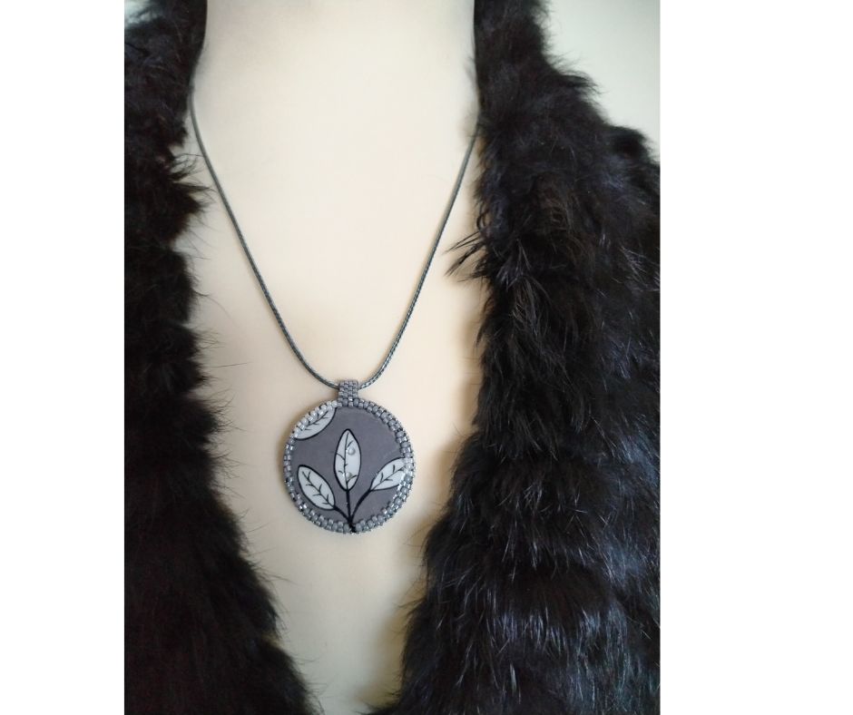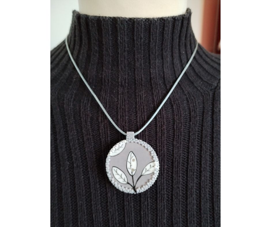 Bouton en porcelaine de la marque « Sibelle ma belle », feuilles blanches sur fond gris serti de perles japonaises irisées grises et blanches. A l’arrière, les perles sont noires et gris perlé avec quelques touches de blanc. Le dos du bouton est agrémenté d’un joli papier japonais, avec vernis de protection. Pendentif entièrement fait main fourni avec un lien gris de longueur totale 42 cm + fermeture et extension chainette dorée de 5 cm.