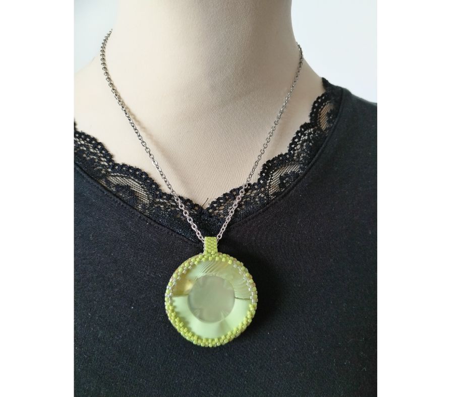 Bouton vert anis translucide serti de perles japonaises irisées vertes. A l’arrière, les perles sont vertes avec quelques touches de blanc. L’arrière du bijou est agrémenté d’un joli papier japonais fleuri, avec vernis de protection.