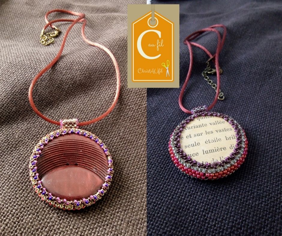 Bouton ref 14043 rouge foncé, diamètre 4,8 cm serti de perles japonaises rouges, grises, violettes. Le verso est agrémenté d’un texte choisi. Pendentif entièrement fait main fourni avec un lien de longueur totale 48 cm avec fermeture  et chaînette lg 5 cm.