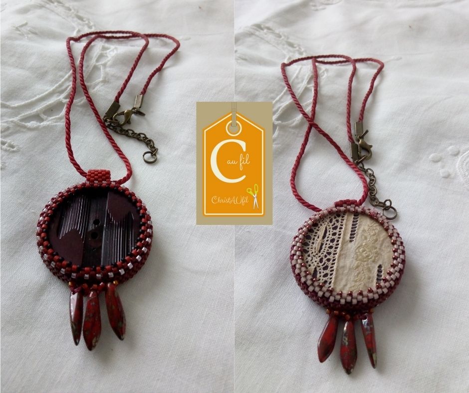 Bouton ref 14041 de couleur rouge sombre avec dessin de stries. Diamètre 3,5 cm serti de perles japonaises rouges. Le verso est agrémenté d’une dentelle couleur ivoire ancienne. Pendentif entièrement fait main fourni avec un lien de longueur totale 50 cm avec fermeture et chaînette lg 4 cm.