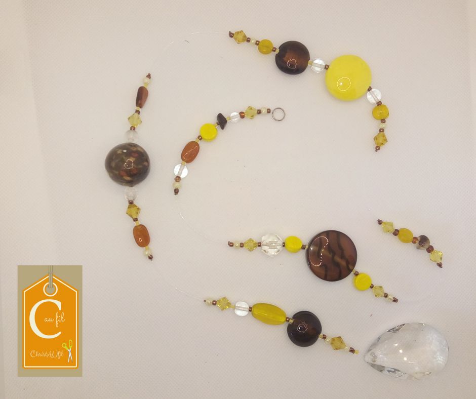 Suspension ref 98035 réalisée à partir de perles en majorité jaunes, marron, bronze, transparentes et d’une pampille en cristal. Elle saura apporter des couleurs et jouer avec les rayons du soleil pour décorer avec douceur votre intérieur. Longueur totale : 90 cm