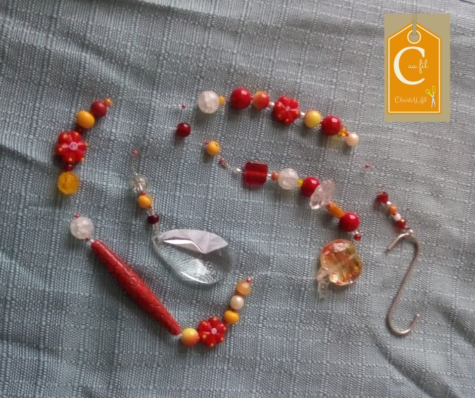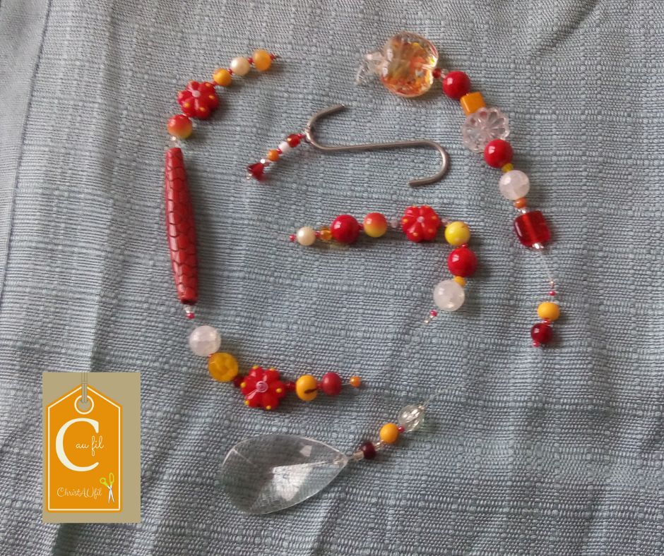 Suspension ref 99016 réalisée à partir de perles à dominantes orange, rouges, jaunes avec une perle en forme de pomme et une pampille en cristal. Elle saura apporter des couleurs et jouer avec les rayons du soleil pour décorer avec douceur votre intérieur. Longueur totale : 79 cm