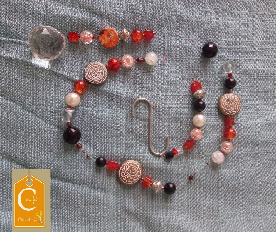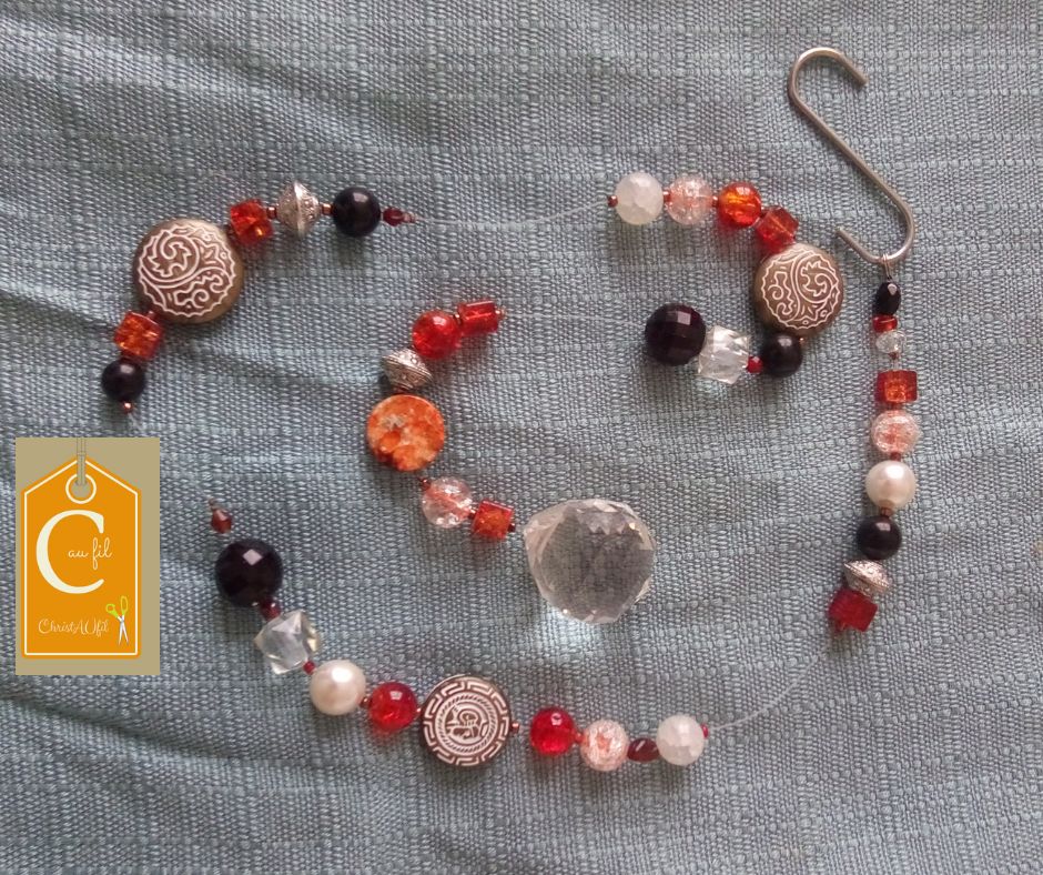 Suspension ref 99026 réalisée à partir de perles en majorité oranges, noires, bois et d’une pampille ronde en cristal. Elle saura apporter des couleurs et jouer avec les rayons du soleil pour décorer avec douceur votre intérieur. Longueur totale : 75 cm