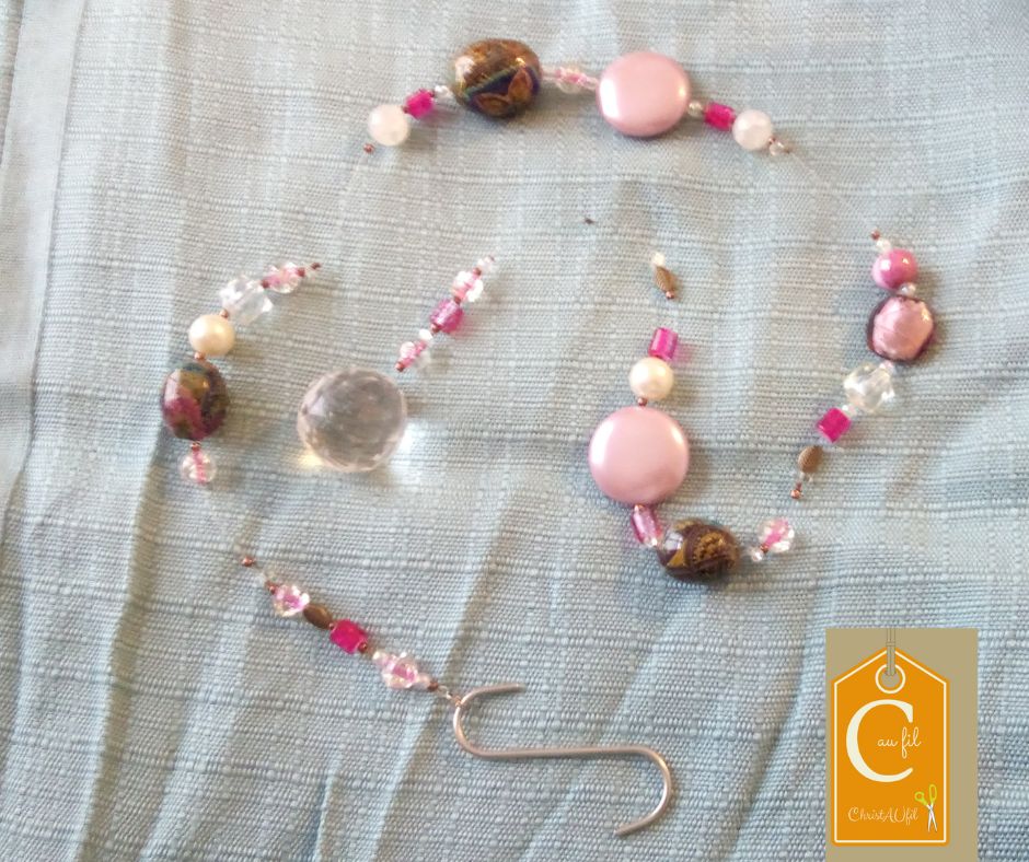 Suspension ref 94013 réalisée à partir de perles avec différentes teintes de rose et d’une pampille ronde en cristal. Elle saura apporter des couleurs et jouer avec les rayons du soleil pour décorer avec douceur votre intérieur. Longueur totale : 79 cm