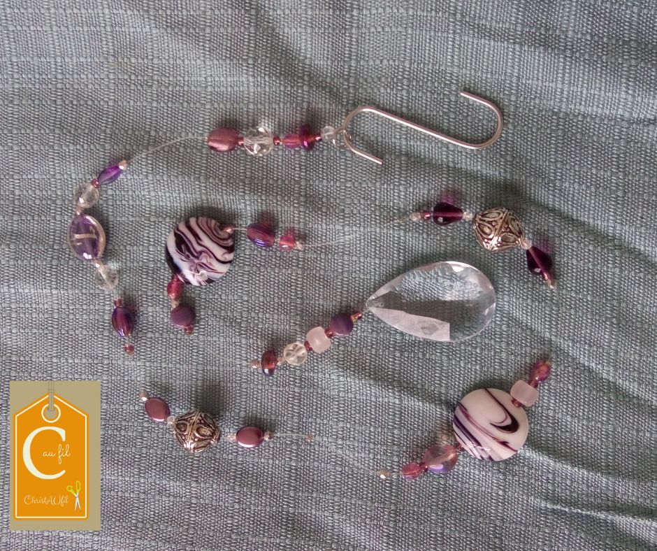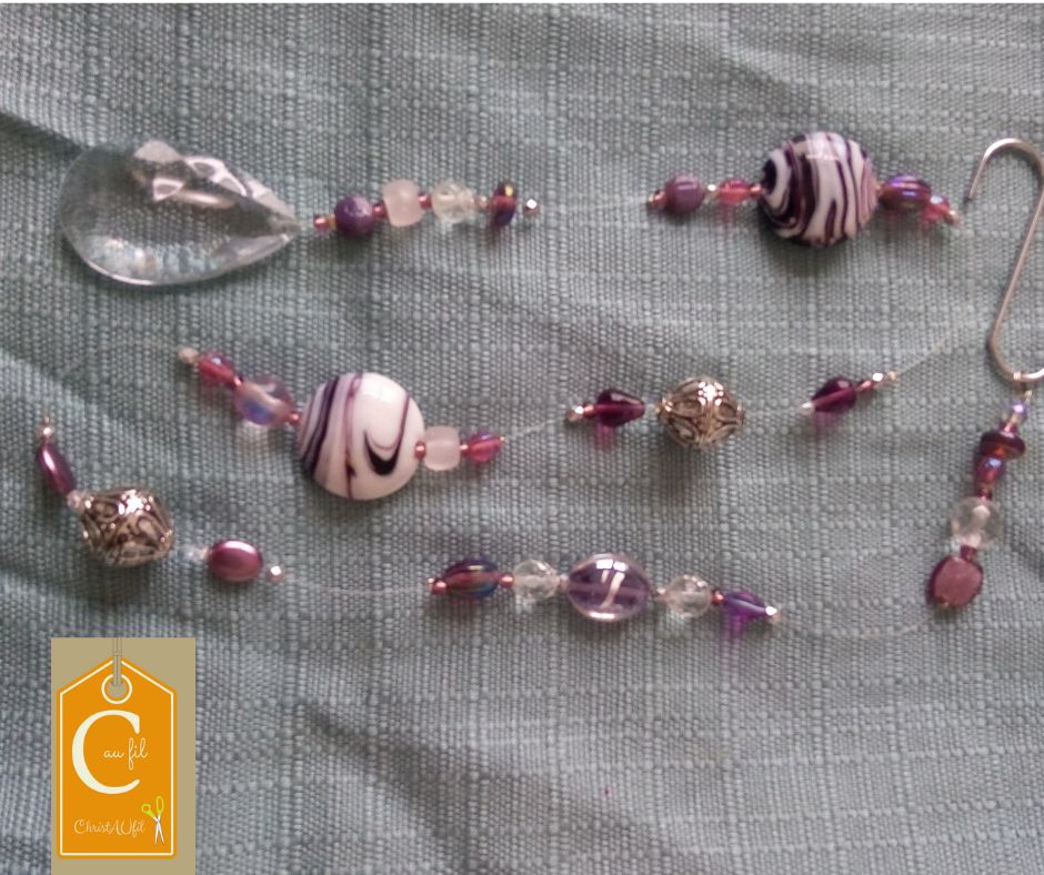 Suspension ref 94023 réalisée à partir de perles à prédominance rose, violine, métal et d’une pampille en cristal. Elle saura apporter des couleurs et jouer avec les rayons du soleil pour décorer avec douceur votre intérieur. Longueur totale : 76 cm