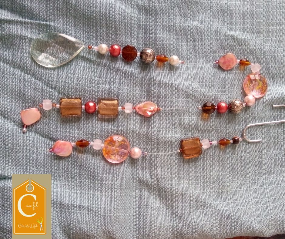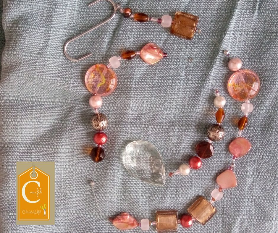 Suspension ref 96018 réalisée à partir de perles avec différentes teintes de saumon et de brun et d’une pampille en cristal. Elle saura apporter des couleurs et jouer avec les rayons du soleil pour décorer avec douceur votre intérieur. Longueur totale : 76 cm