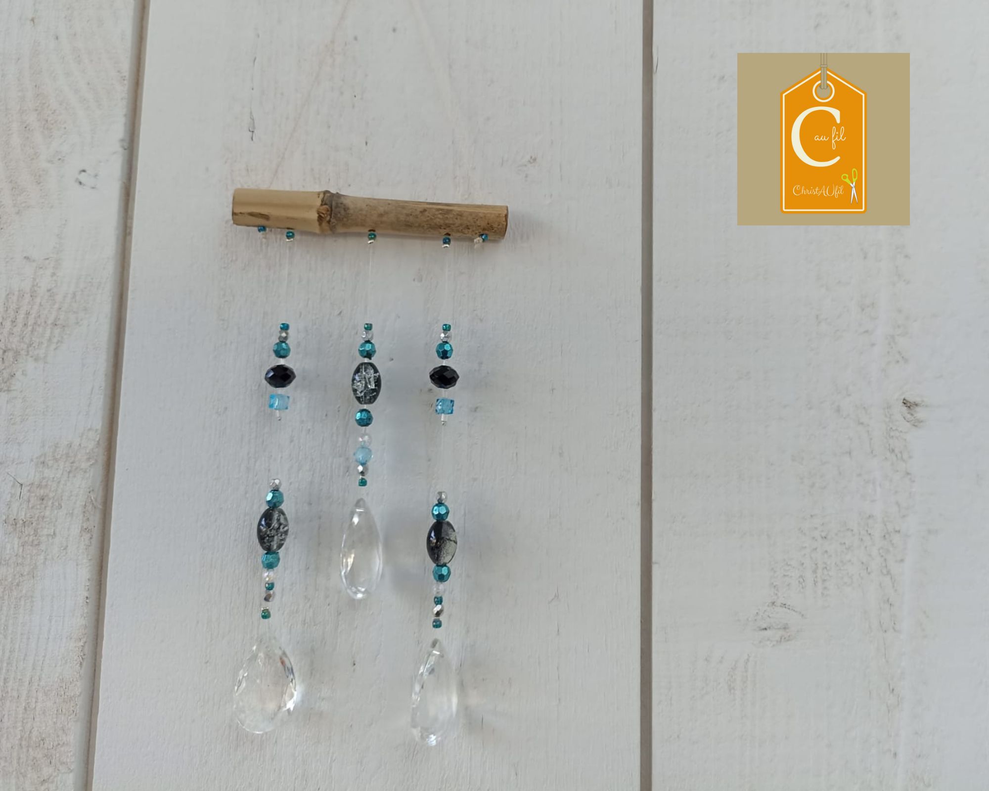 Suspension ref 82005 réalisée à partir de perles bleues et noires et de 3 pampilles en verre transparent. Elle saura apporter des couleurs et jouer avec les rayons du soleil pour décorer avec douceur votre intérieur. Longueur du bambou = 9 cm, hauteur sous le bambou : 16 cm