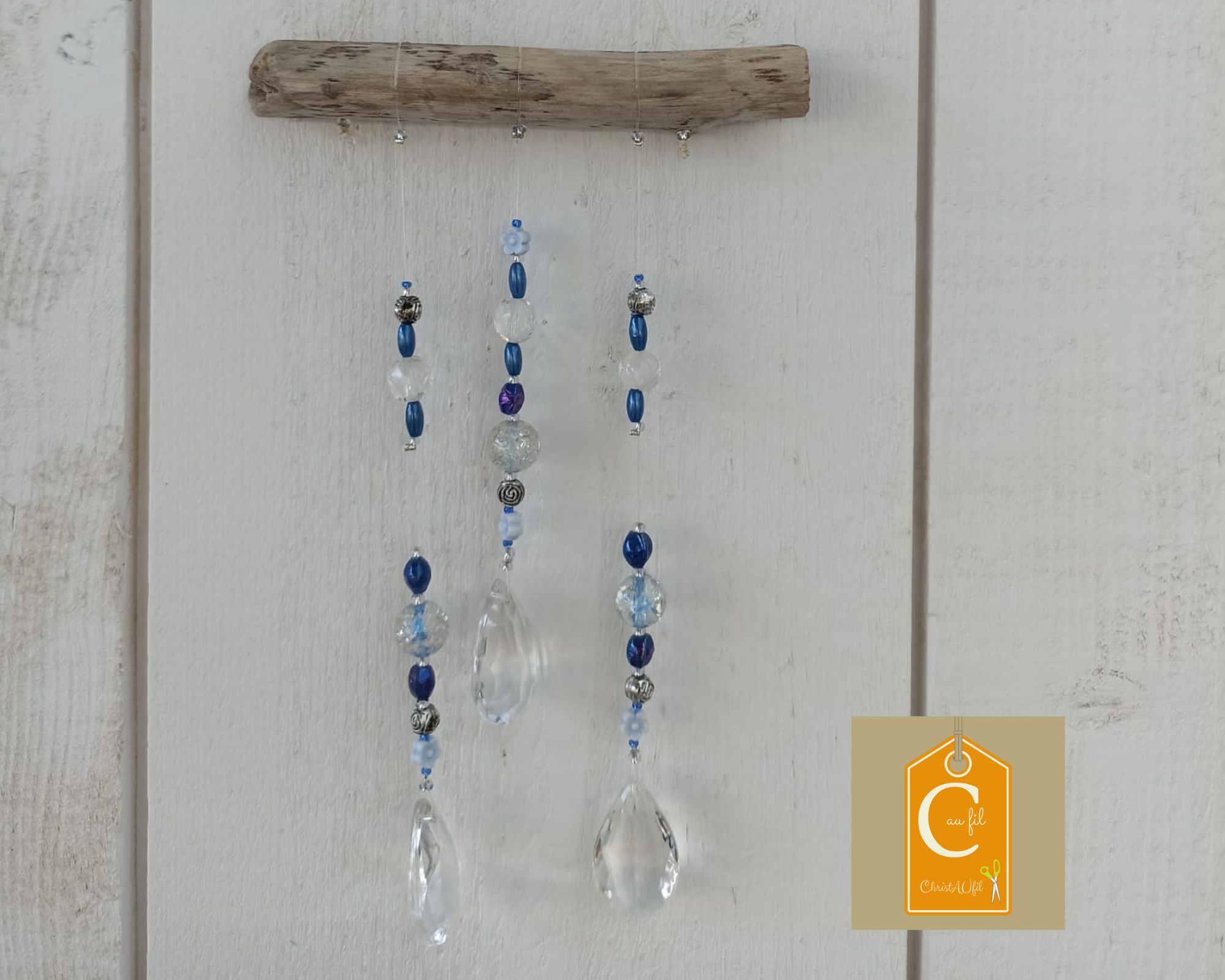 Suspension ref 83002 réalisée à partir de perles bleues et aspect cristal et de 3 pampilles en verre transparent. Elle saura apporter des couleurs et jouer avec les rayons du soleil pour décorer avec douceur votre intérieur. Longueur du bois flotté = 13 cm, hauteur sous le bois flotté : 19 cm