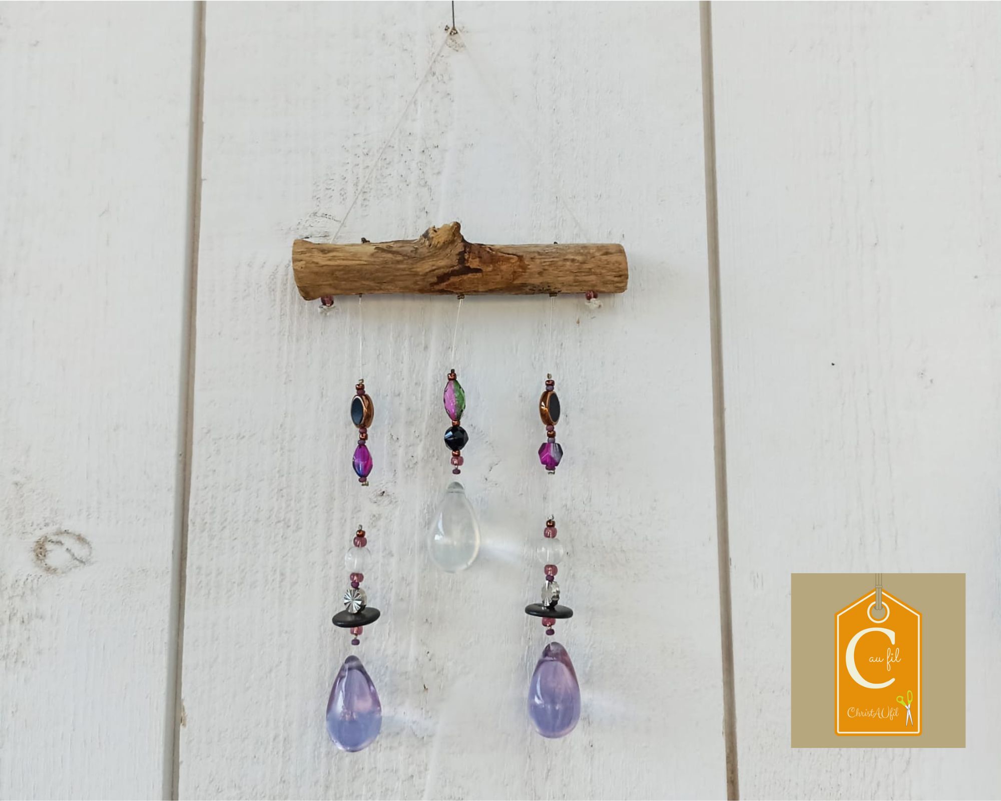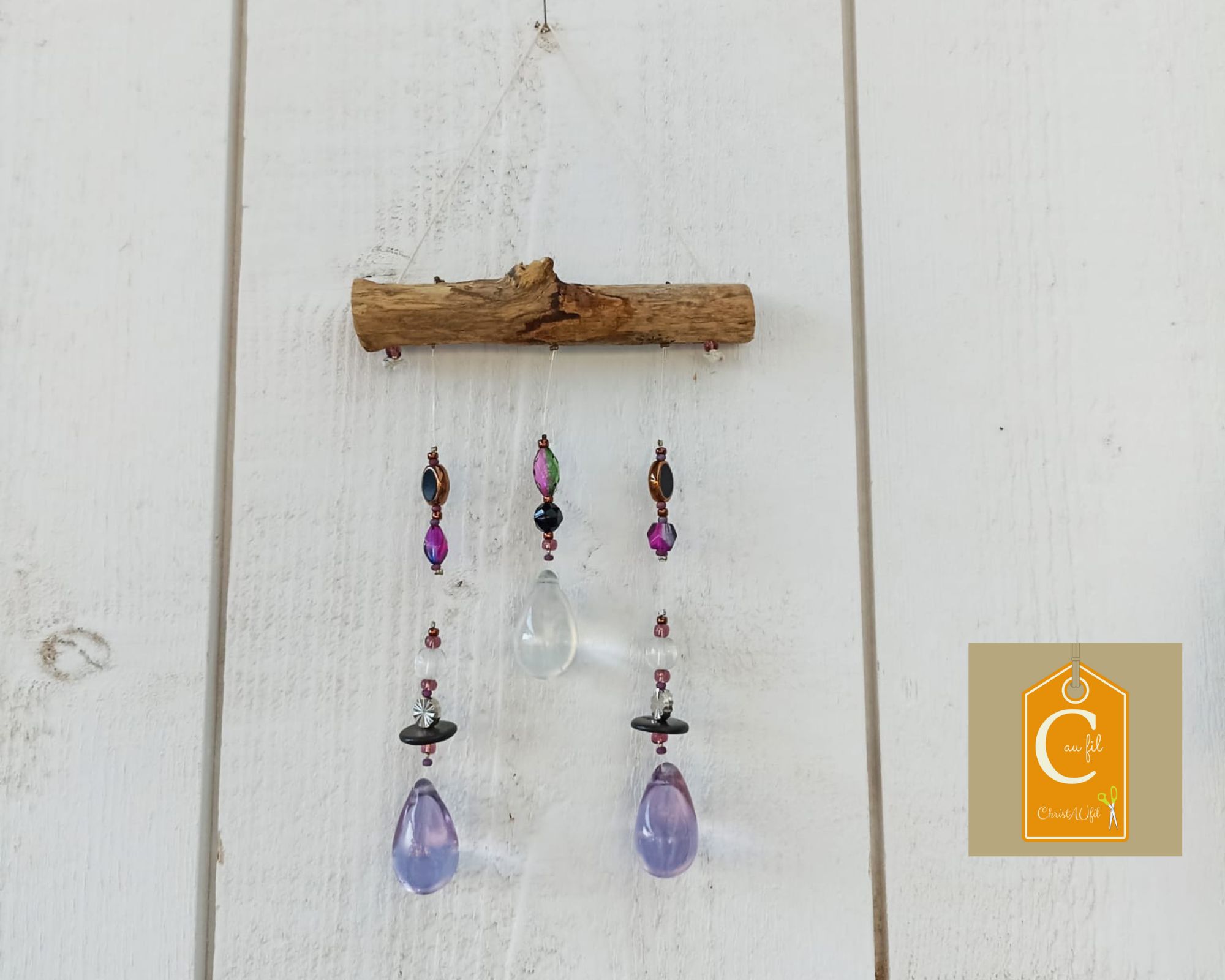 Suspension ref 84017 réalisée à partir de perles mauves et transparentes et de 2 pampilles en verre mauve et 1 pampille en verre transparent. Elle saura apporter des couleurs et jouer avec les rayons du soleil pour décorer avec douceur votre intérieur. Longueur du bois flotté = 11 cm, hauteur sous le bois flotté : 14 cm