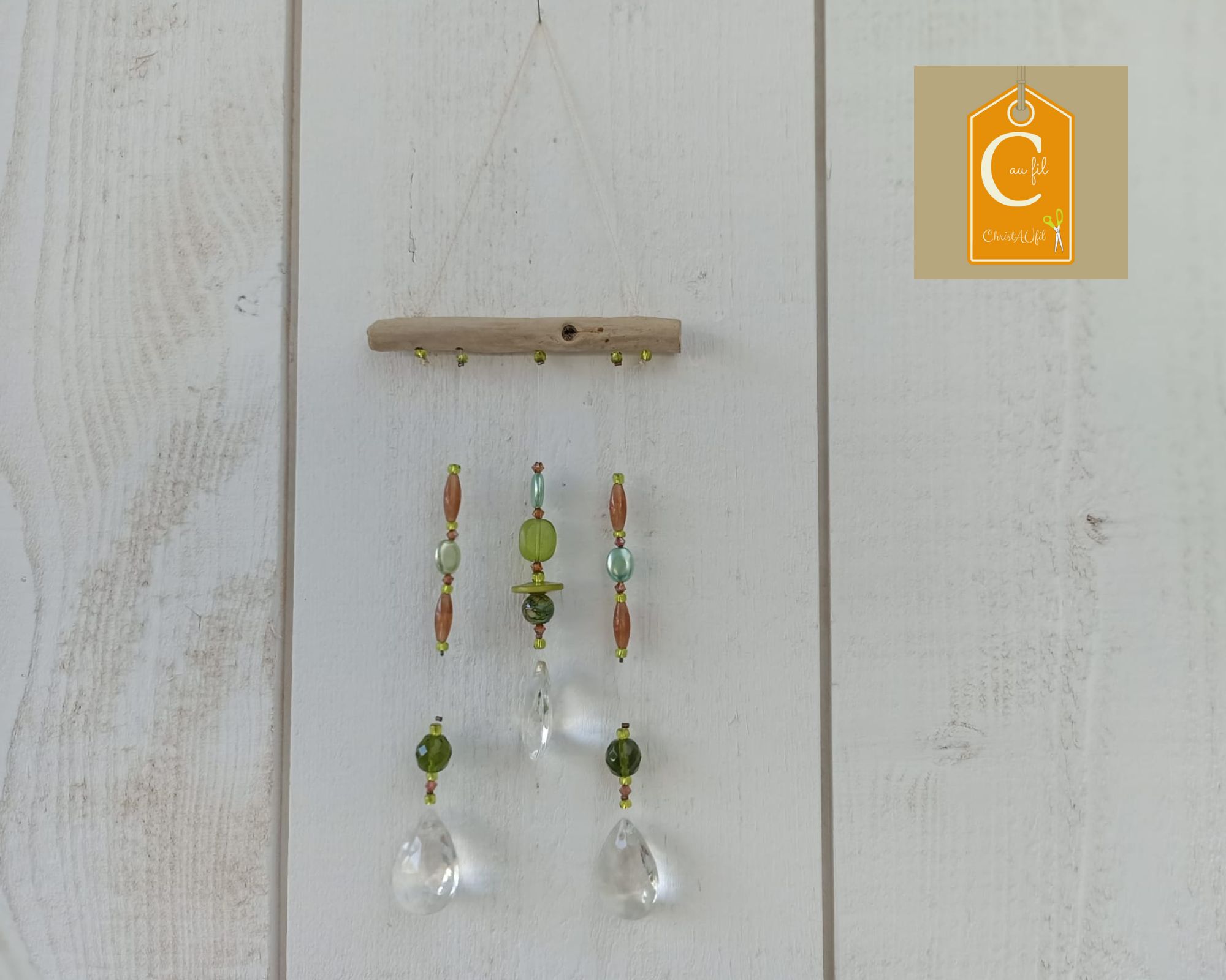 Suspension ref 85003 réalisée à partir de perles à dominante verte et de 3 pampilles en verre à facettes. Elle saura apporter des couleurs et jouer avec les rayons du soleil pour décorer avec douceur votre intérieur. Longueur du bois flotté = 10 cm, hauteur sous le bois flotté : 18 cm