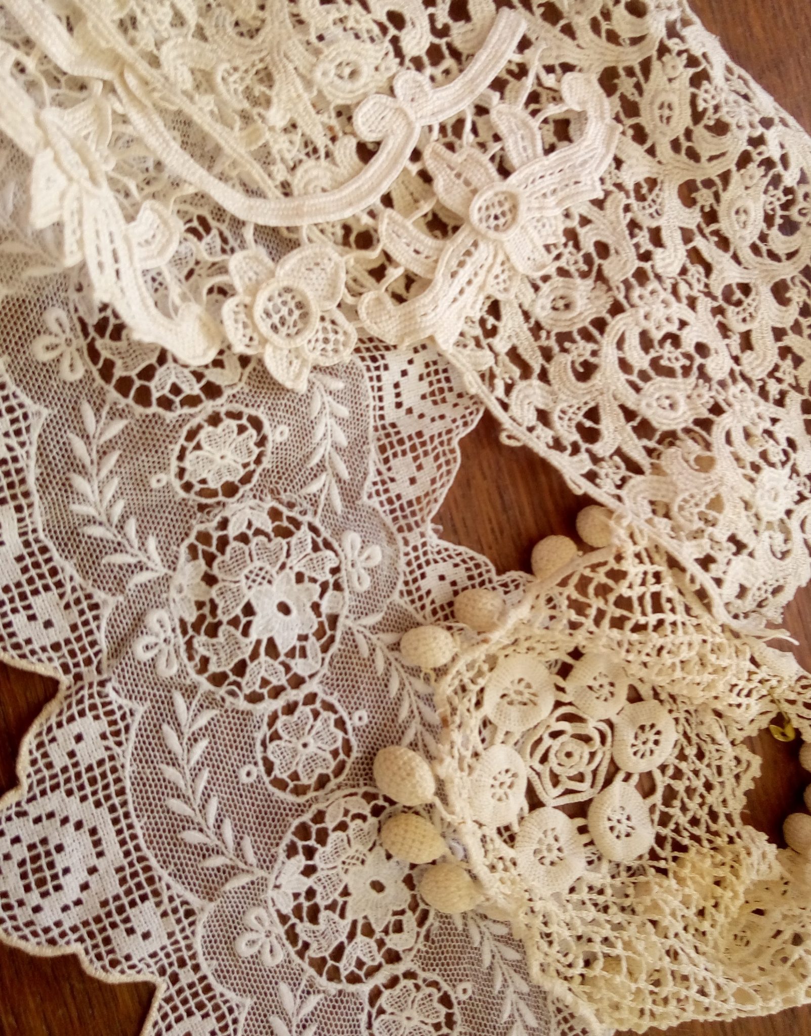 Les boutons et dentelles ne restent plus dans les travailleuses de nos grand-mères, ils poursuivent leur vie : c’est ça la transmission de générations en générations. Je chine donc les boutons anciens mais utilise également des boutons plus récents lorsqu’ils présentent une certaine originalité. Je touche le bouton, j’imagine déjà les couleurs qui vont le mettre en valeur, j’ai les doigts qui fourmillent, alors je brode à l’aiguille de minuscules perles japonaises pour enchâsser ou si vous préférez pour sertir le bouton. Les petits motifs des dentelles anciennes sont découpés puis placés au verso du bijou. Pour varier, j’utilise parfois de jolis tissus, du cuir ou simili (c’est la partie up-cycling)